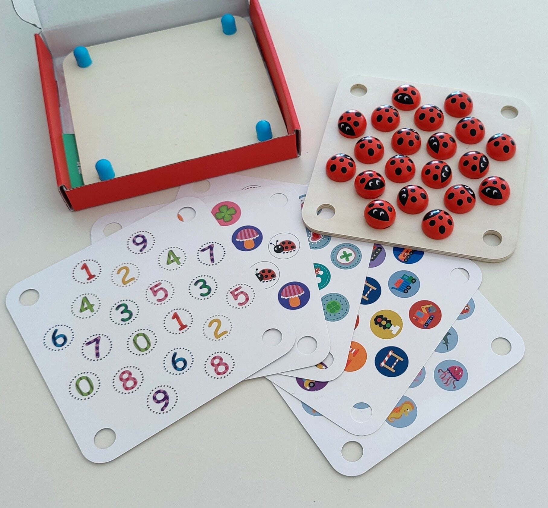 Eine Box mit Spielen zur Förderung der taktilen Wahrnehmung, Steck-spielen und Gedächtnisspielen.