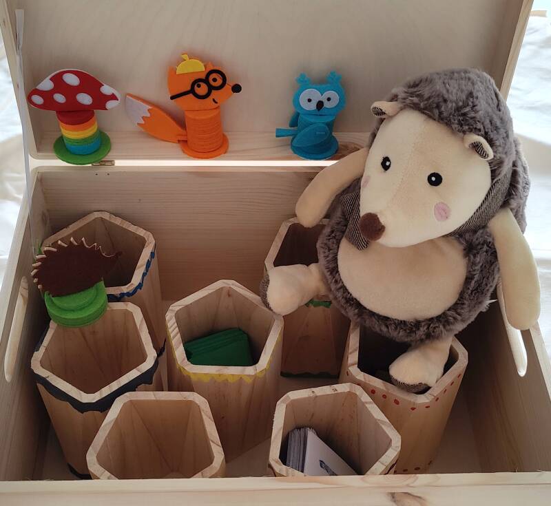 Mittlerweile gibt es für unser Kindergarten-Umweltspiel auch ein Bilderbuch mit dazu passender Geschichte. Zu Igel Ilma hat sich nun noch Eichhörnchen Fips gesellt, eine Handpuppenfigur.