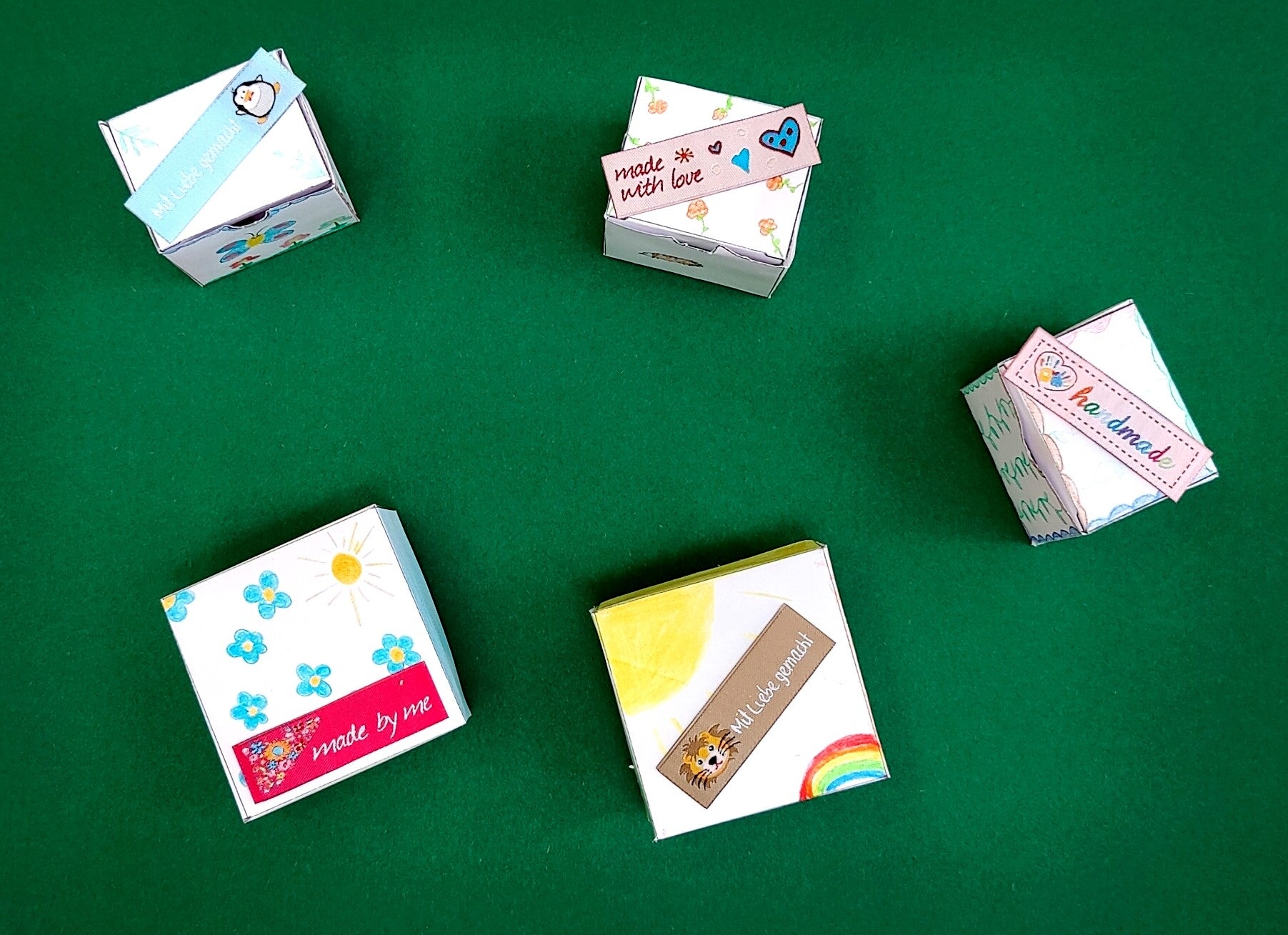 Blumenkugeln zum Mitnehmen in von Schülern gebastelten Papierbehältern