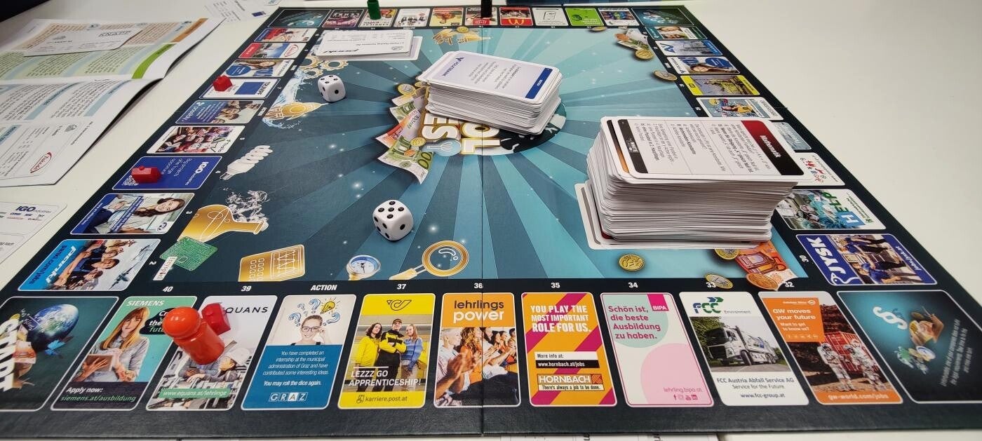 Dieses Brettspiel kombiniert die Spielprinzipien von Monopoly® bzw. DKT® und Trivial Pursuit® und ist für Schüler:innen besonders einfach zu erlernen. Statt Straßen zu kaufen, werden bei MINT School Games Unternehmen gegründet und weiterentwickelt. Vor jeder Aktion müssen Fragen aus dem Lehrstoff beantwortet werden, die praxisnah am Beispiel konkreter Anwendungsmöglichkeiten aus Wirtschaft, Technik und Naturwissenschaften formuliert wurden.