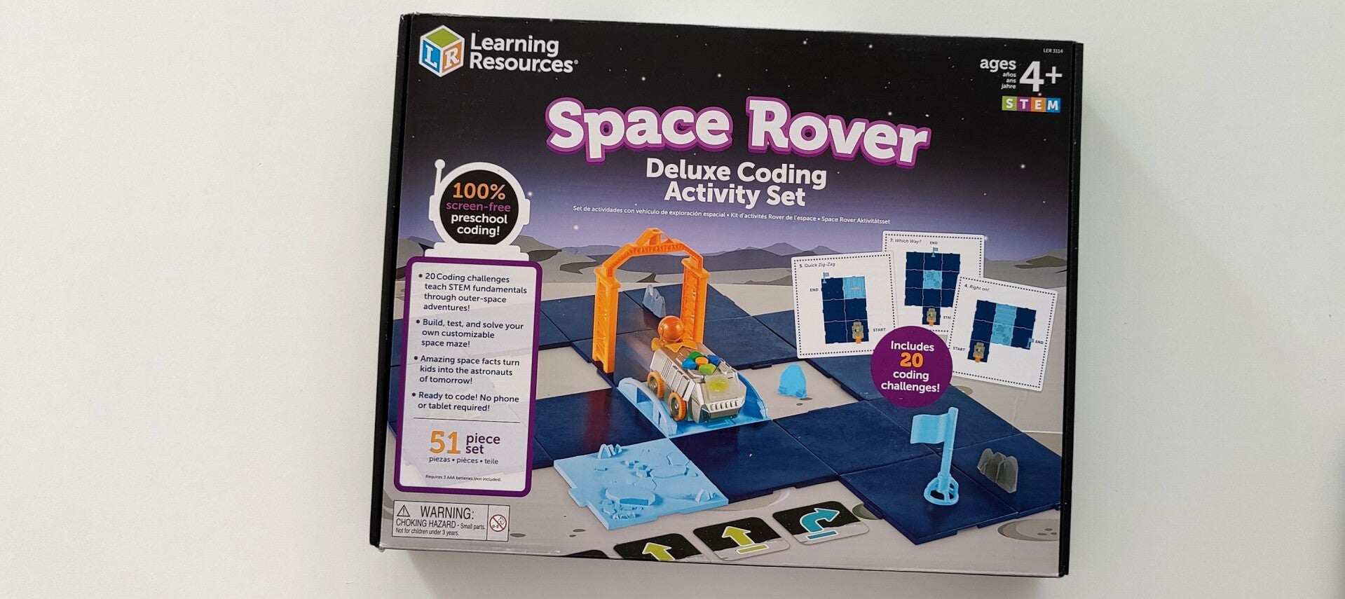 Der interaktive Programmierroboter wird per Knopfdruck programmiert und ermöglicht jede Menge unterhaltsames, praktisches Spielen. Schüler:innen können den Codierpfad mit den Codierkarten planen und anschließend den Rover losschicken, um magnetische Weltraumfelsen zu greifen, unebenes Gelände zu meiden und wieder sicher zur Basis zurückzukehren. Bis zu 100 Einzelschritte kann eine Sequenz beinhalten.